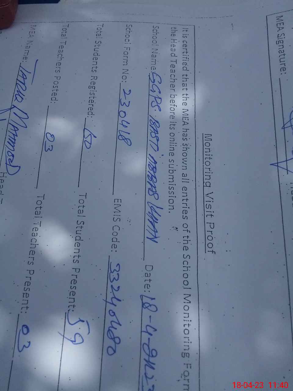 | Attendance Register | Head Teacher | MEA with School | Visit Proof |