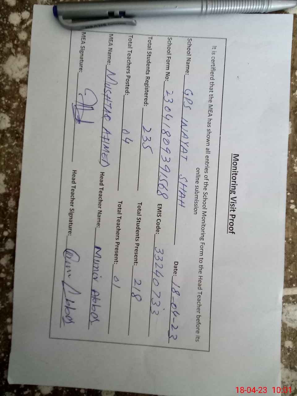 | EMIS Code: 33240733 | Name of School: GPS INAYAT SHAH | |||