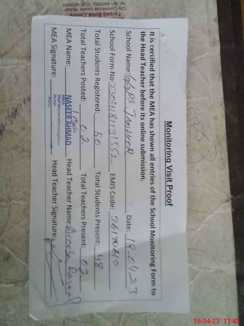 | Attendance Register | Head Teacher | MEA with School | Visit Proof |
