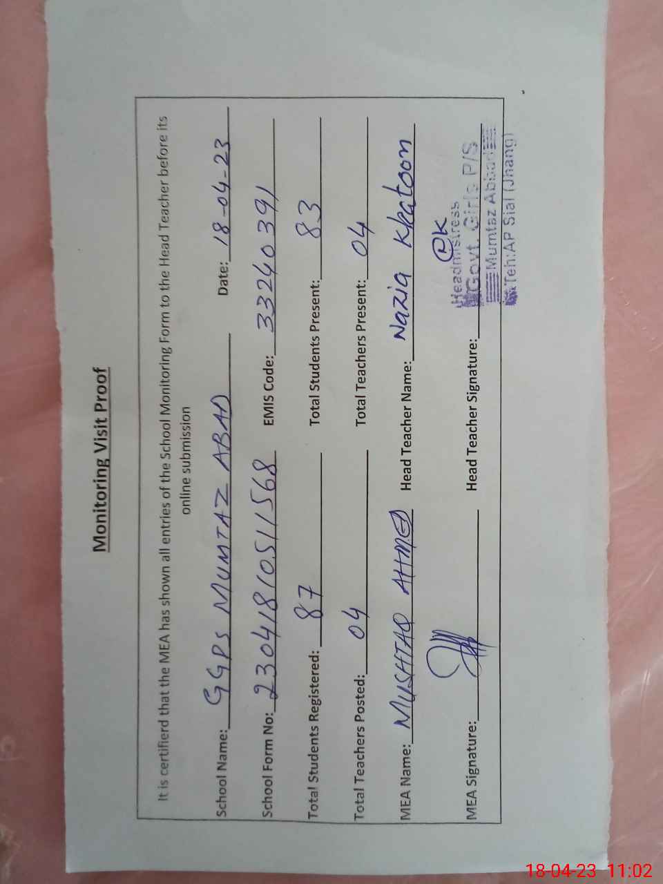 | EMIS Code: 33240391 | Name of School: GGPS MUMTAZ ABAD | |||