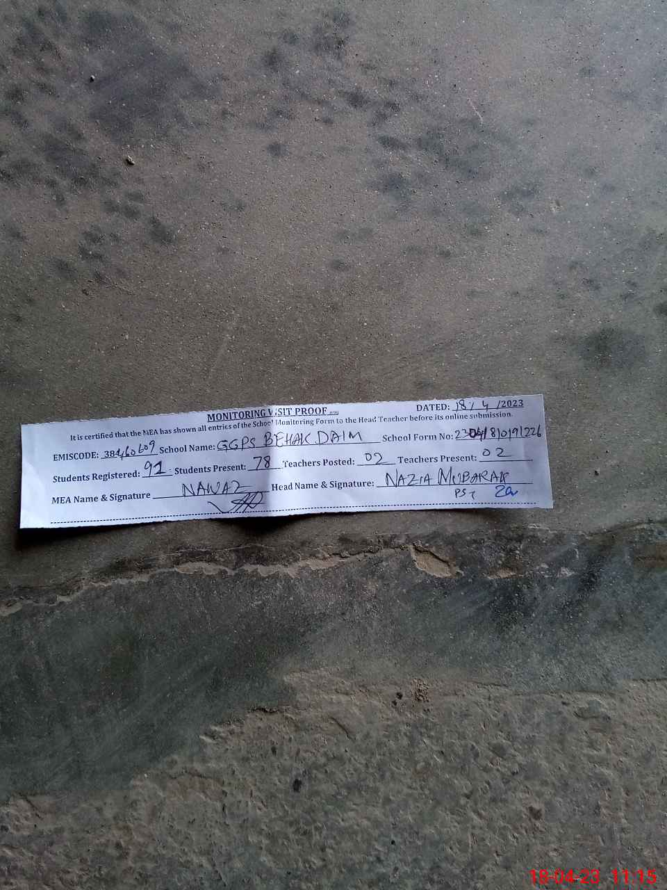 | Attendance Register | Head Teacher | MEA with School | Visit Proof |