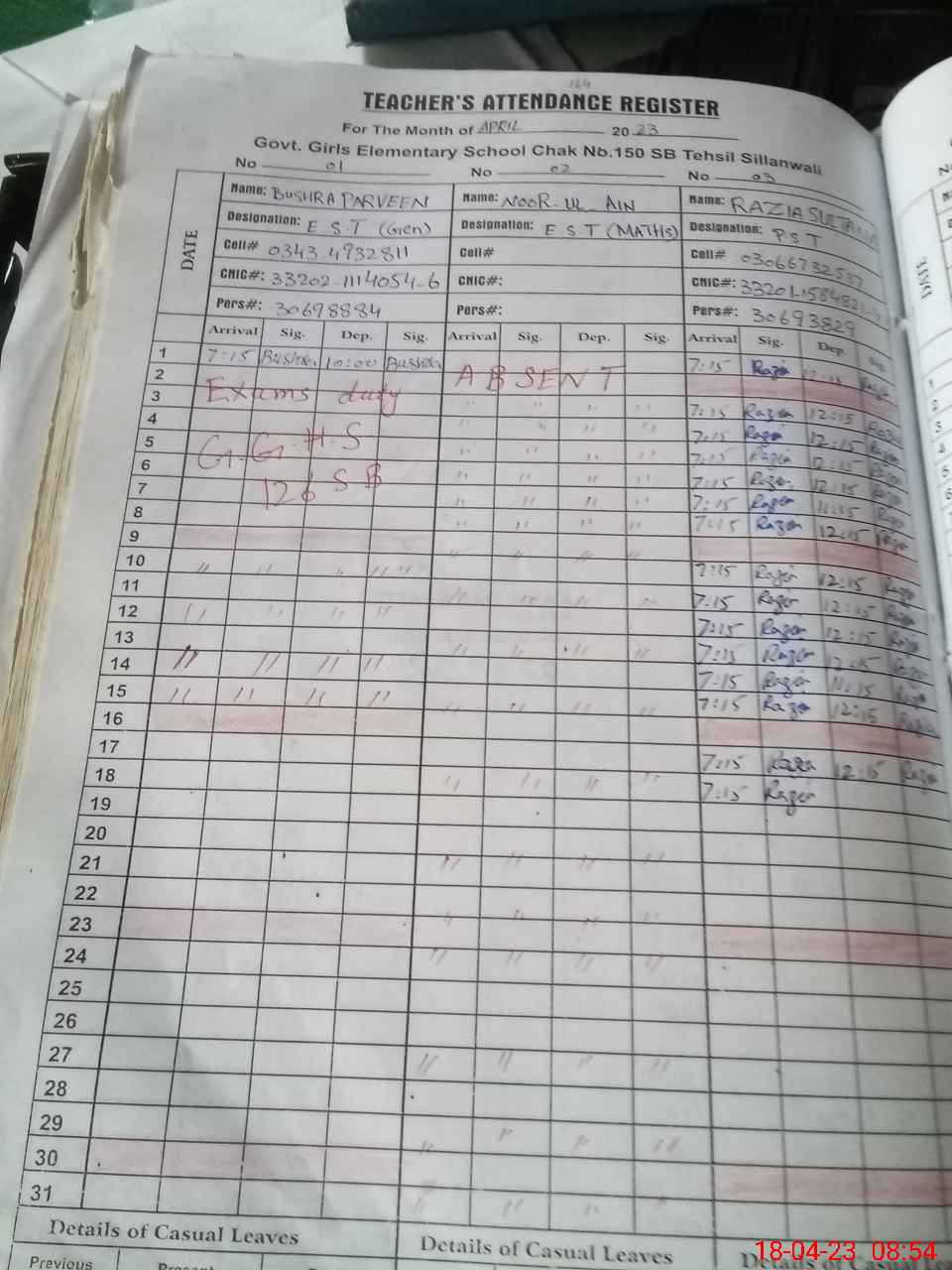 | CNIC | Full Name | Designation | R/C | Absence During Last Calender Month |