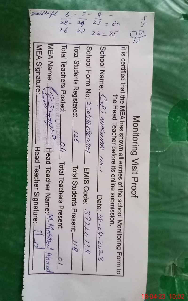| Attendance Register | Head Teacher | MEA with School | Visit Proof |