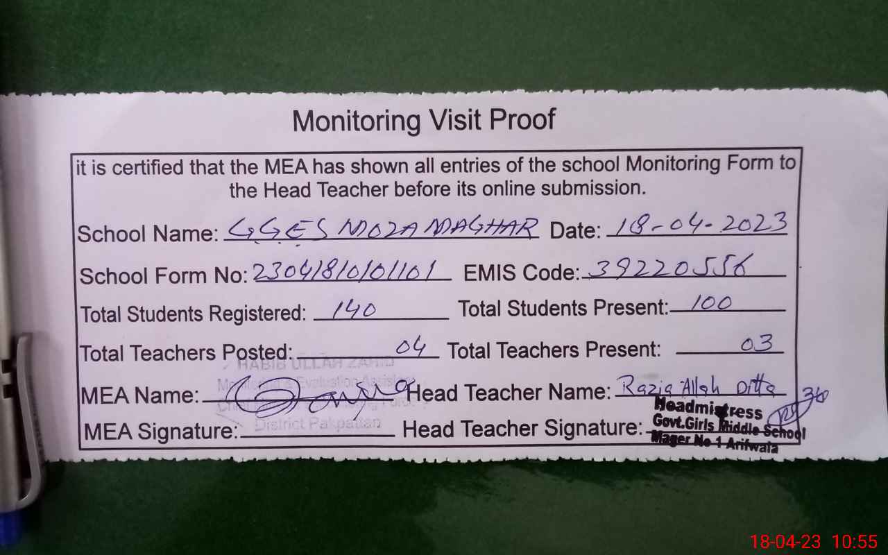 | Attendance Register | Head Teacher | MEA with School | Visit Proof |