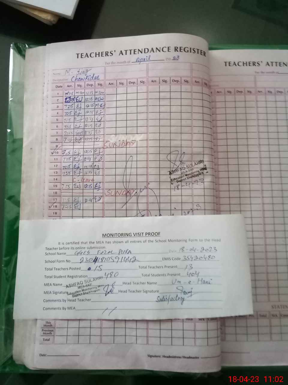 | Attendance Register | Head Teacher | MEA with School | Visit Proof |