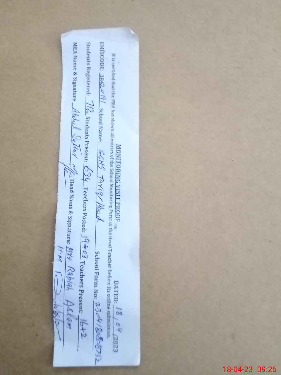 | Attendance Register | Head Teacher | MEA with School | Visit Proof |