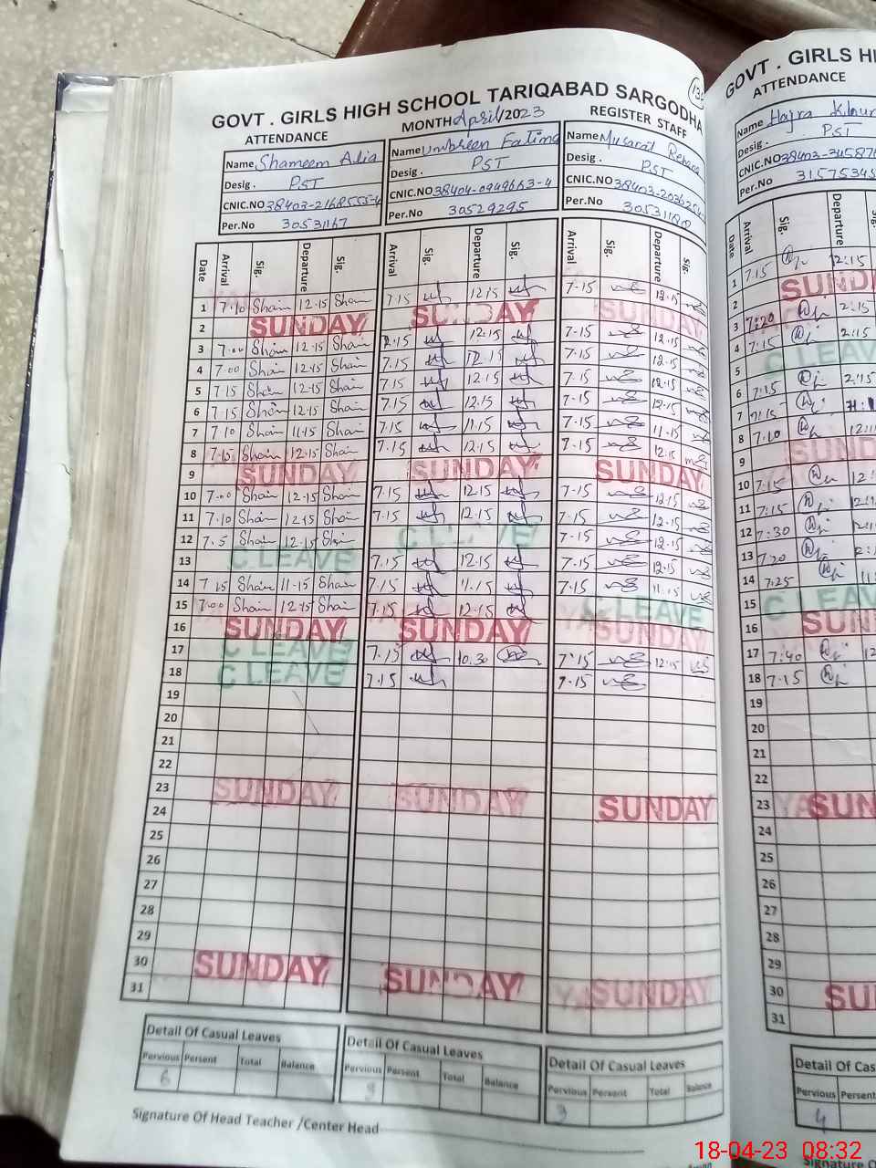 | CNIC | Full Name | Designation | R/C | Absence During Last Calender Month |
