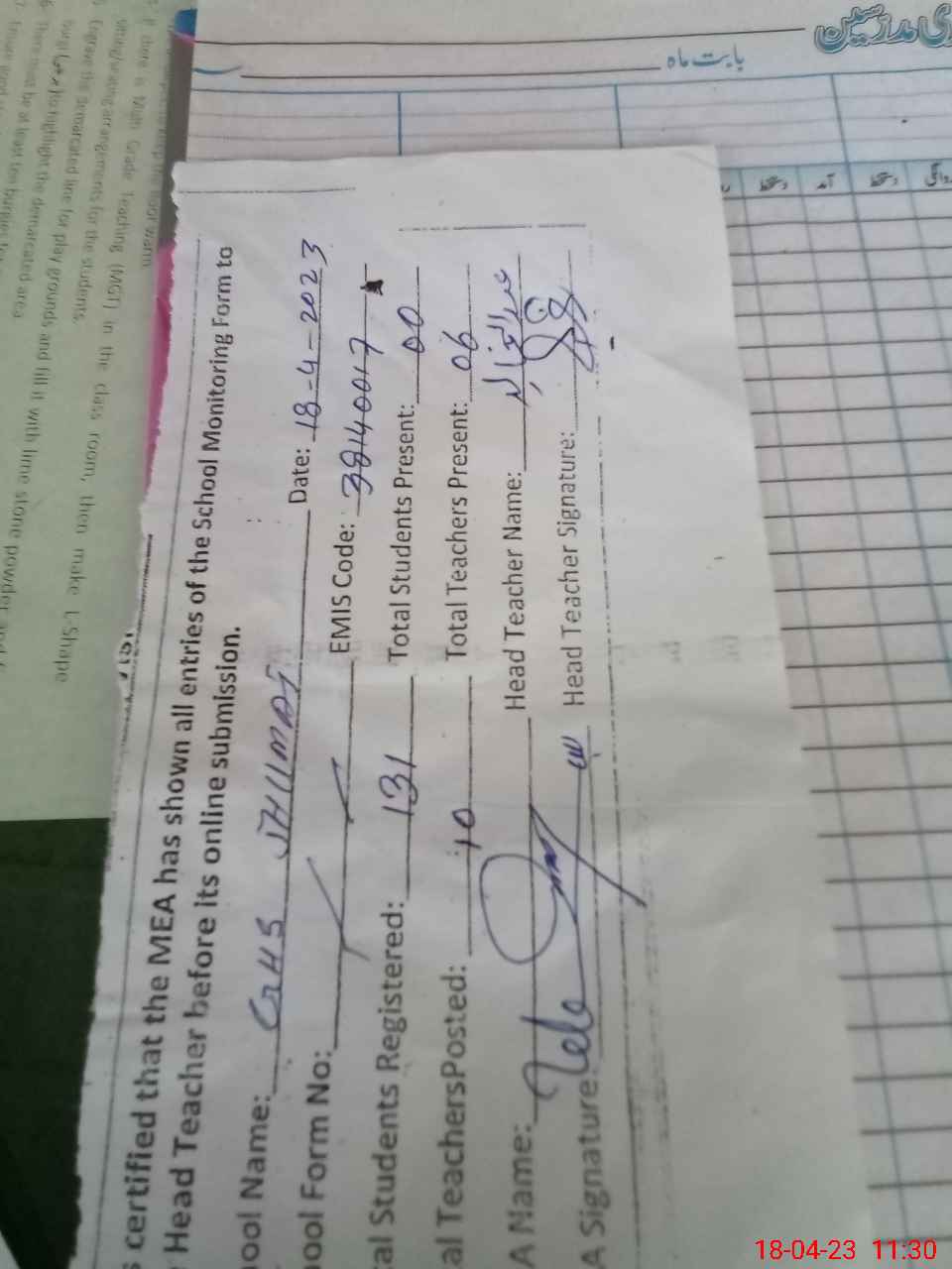 | Attendance Register | Head Teacher | MEA with School | Visit Proof |