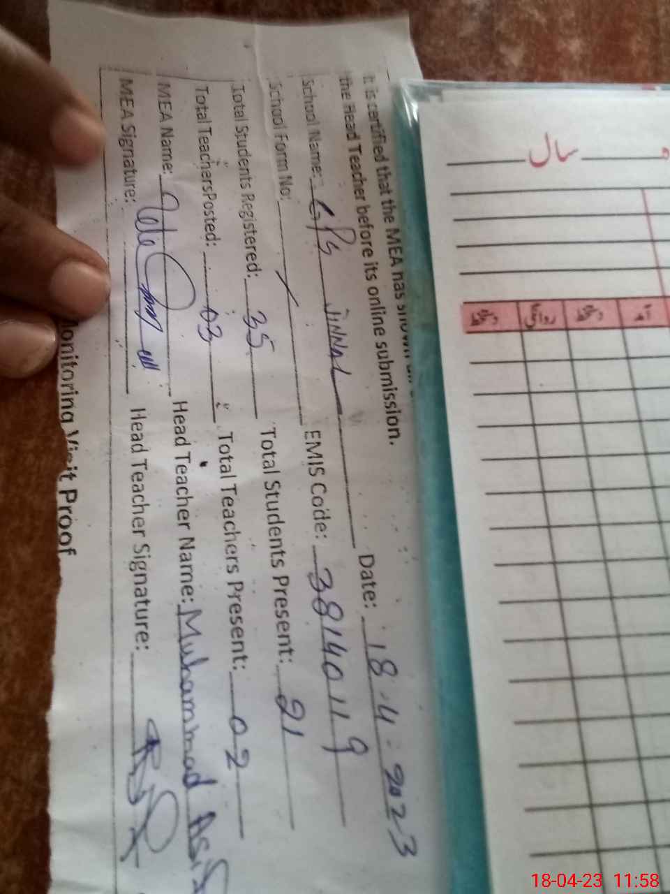 | Attendance Register | Head Teacher | MEA with School | Visit Proof |