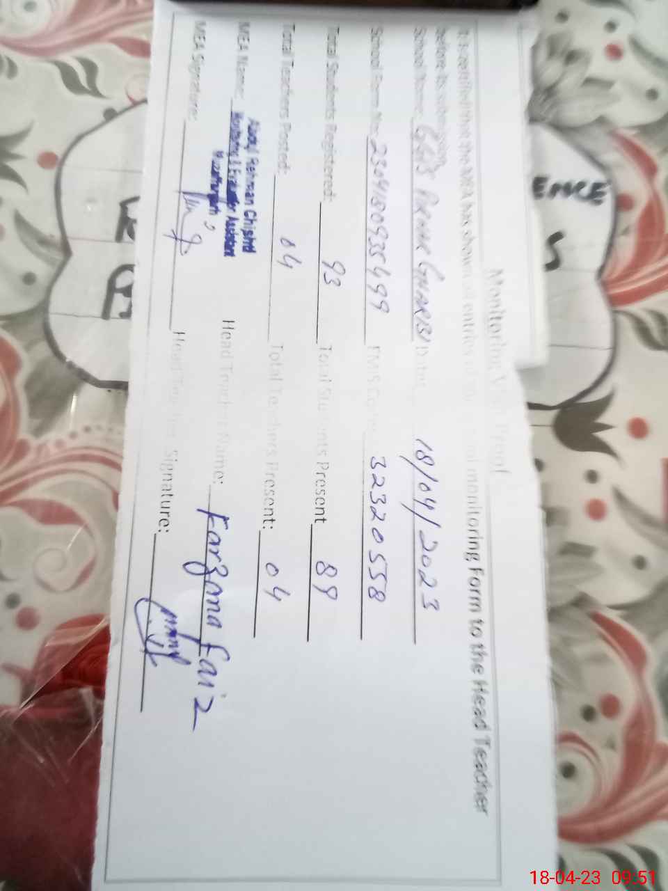 | Attendance Register | Head Teacher | MEA with School | Visit Proof |