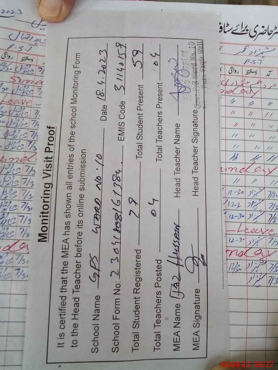 | Attendance Register | Head Teacher | MEA with School | Visit Proof |