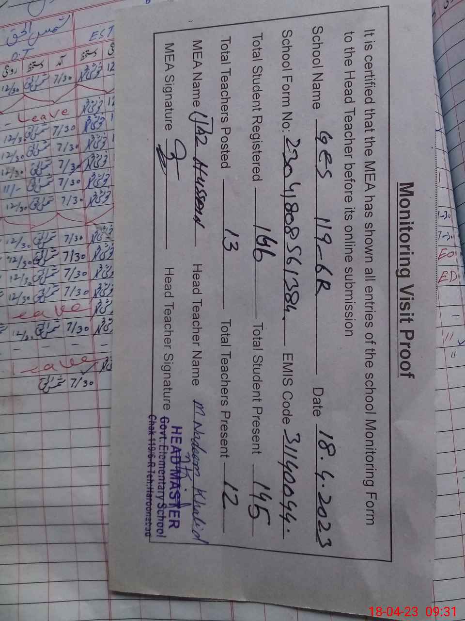 | Attendance Register | Head Teacher | MEA with School | Visit Proof |