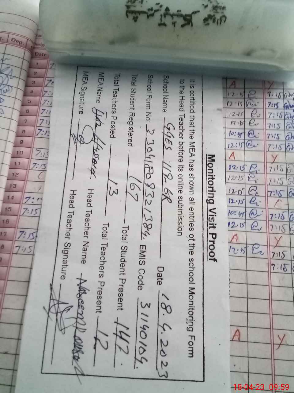 | Attendance Register | Head Teacher | MEA with School | Visit Proof |