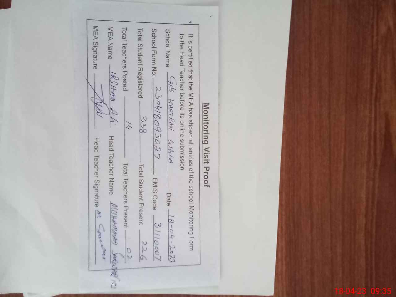 | Attendance Register | Head Teacher | MEA with School | Visit Proof |