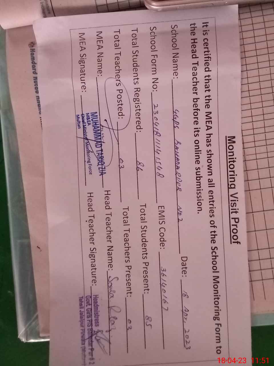 | EMIS Code: 36140167 | Name of School: GGPS BAHADAR PUR NO. 2 JALALPUR PIRWALA | |||