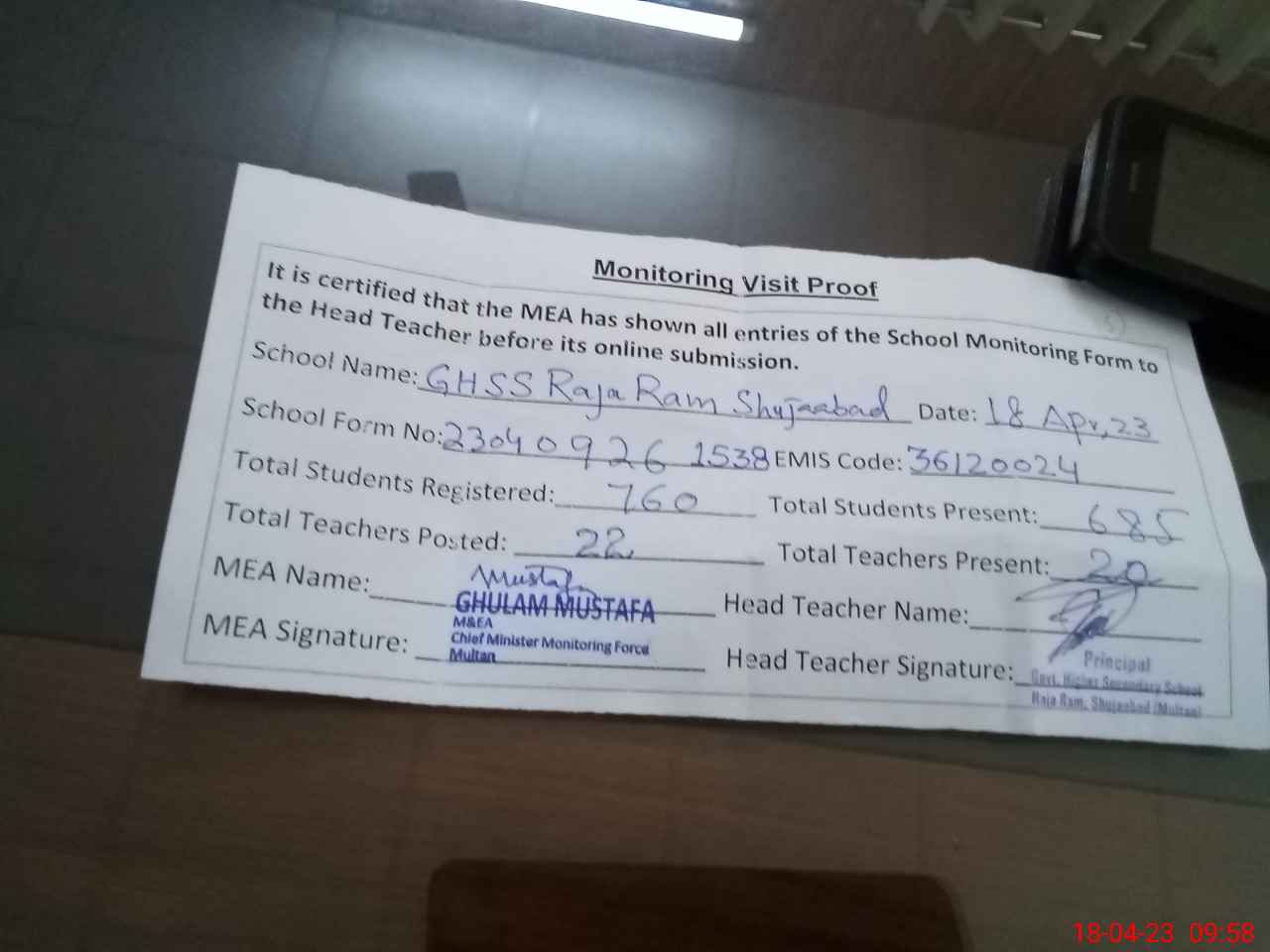 | Attendance Register | Head Teacher | MEA with School | Visit Proof |
