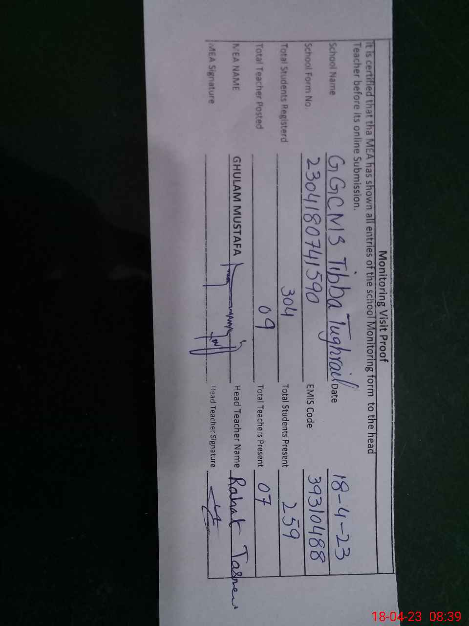 | EMIS Code: 39310488 | Name of School: GGCMS TIBBA TUGHRAIL | |||