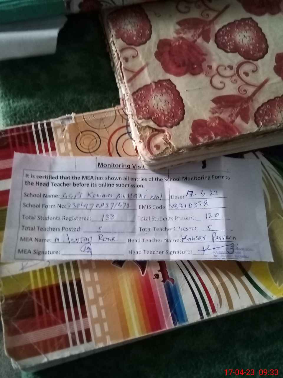 | Attendance Register | Head Teacher | MEA with School | Visit Proof |