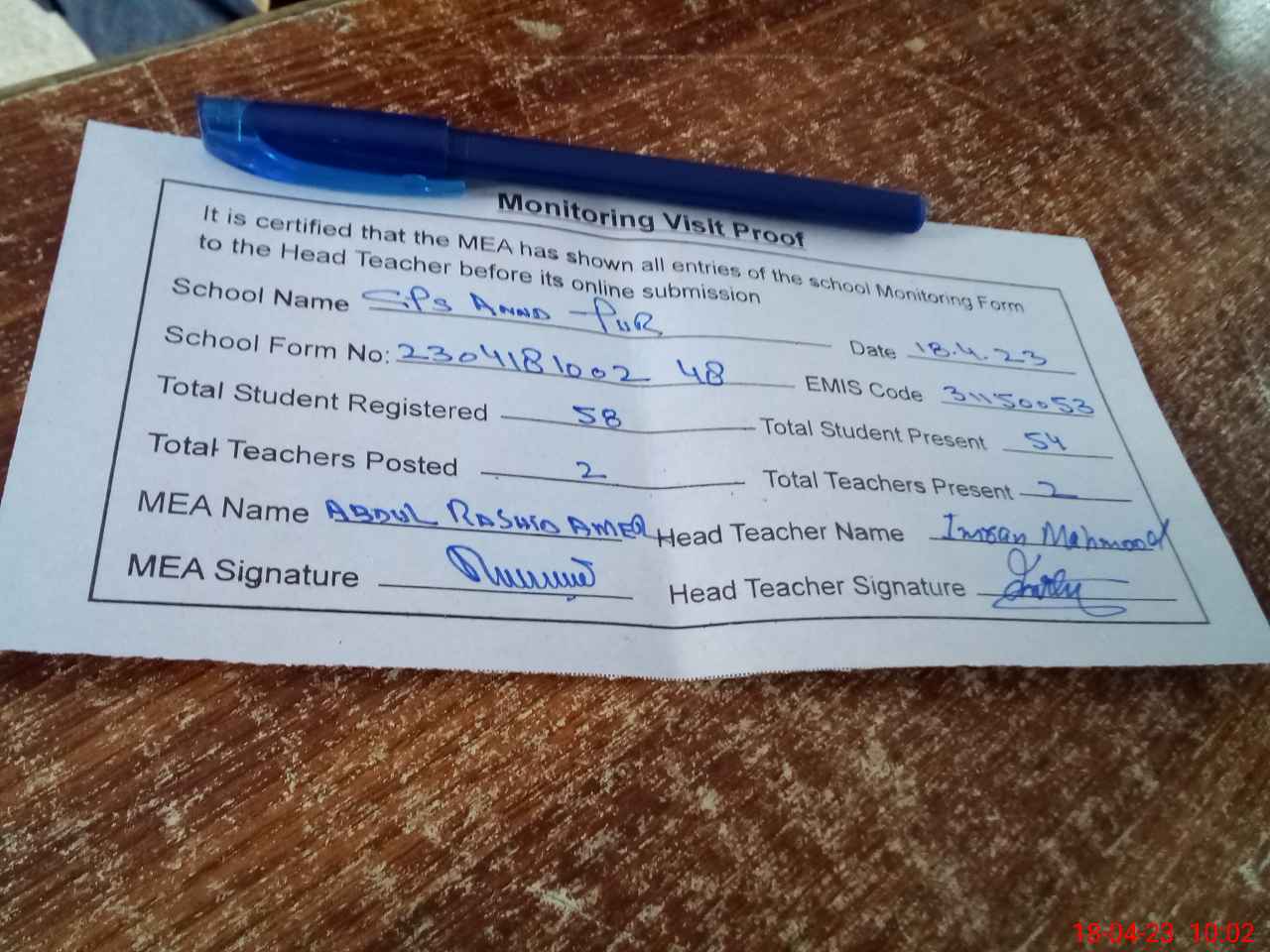 | Attendance Register | Head Teacher | MEA with School | Visit Proof |