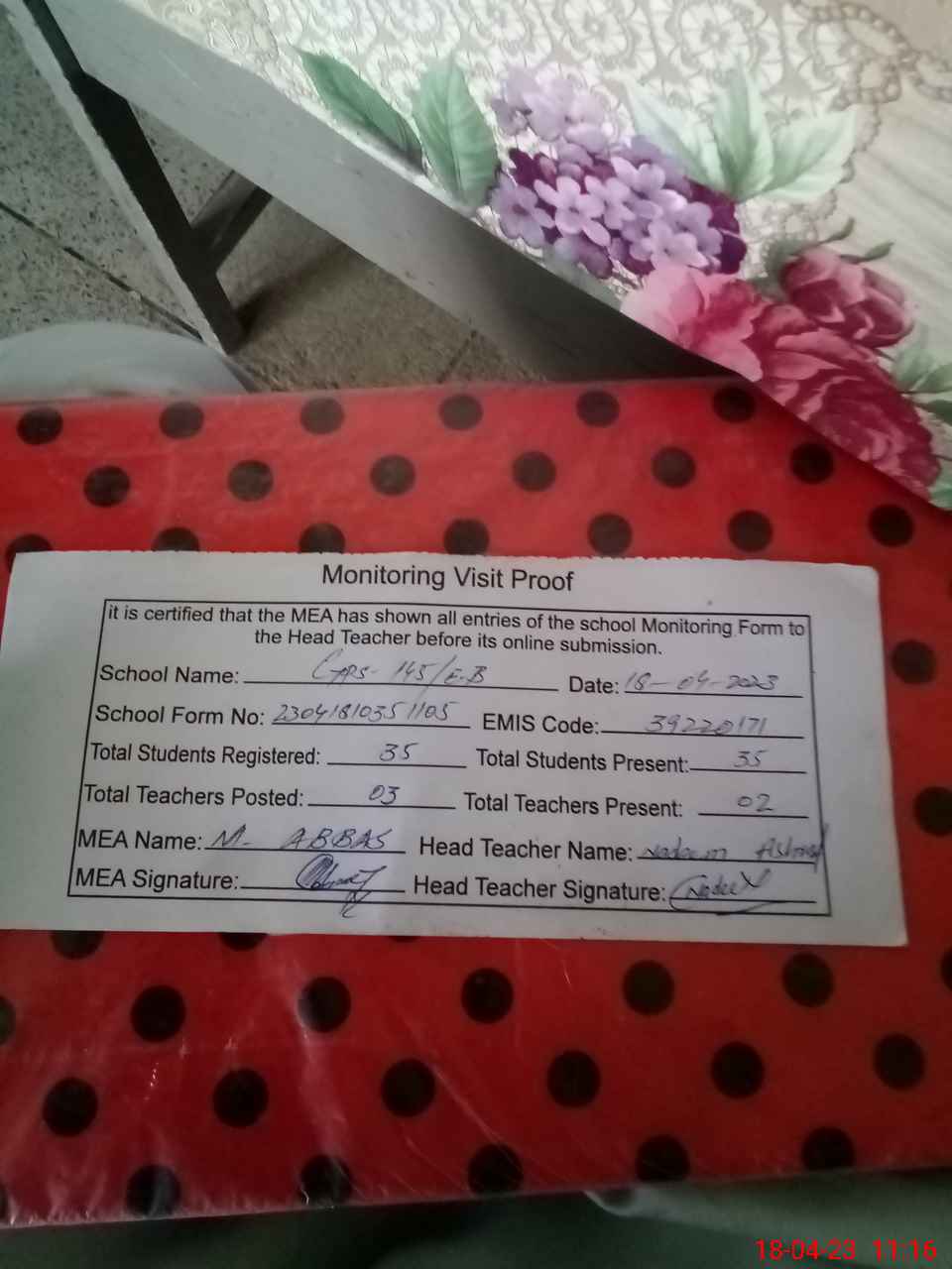 | EMIS Code: 39220171 | Name of School: GPS 145 EB | |||