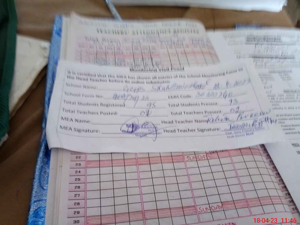 | Attendance Register | Head Teacher | MEA with School | Visit Proof |