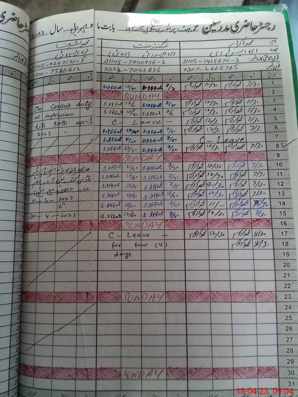 | CNIC | Full Name | Designation | R/C | Absence During Last Calender Month |