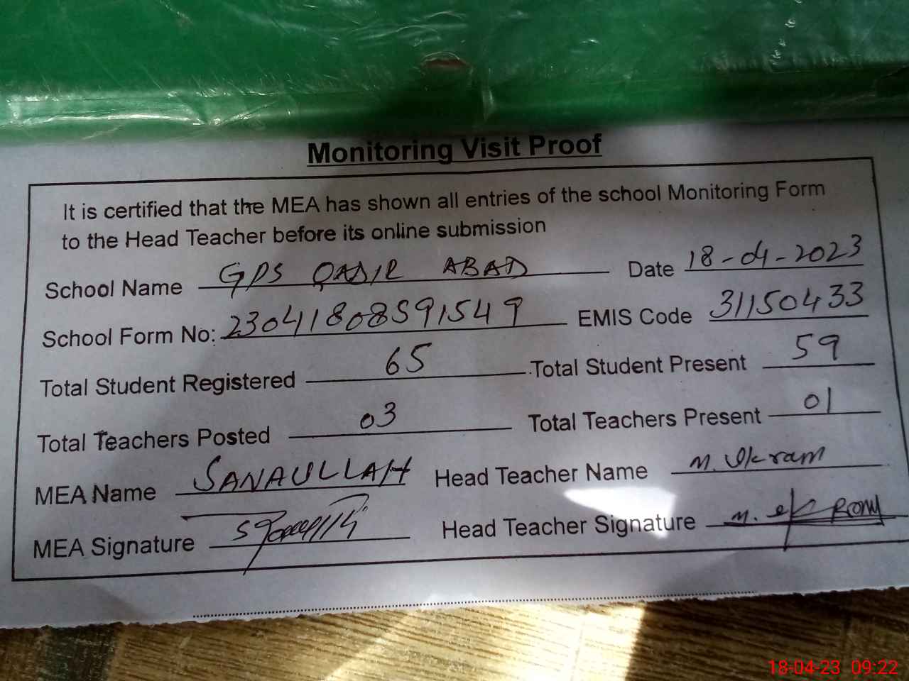 | Attendance Register | Head Teacher | MEA with School | Visit Proof |