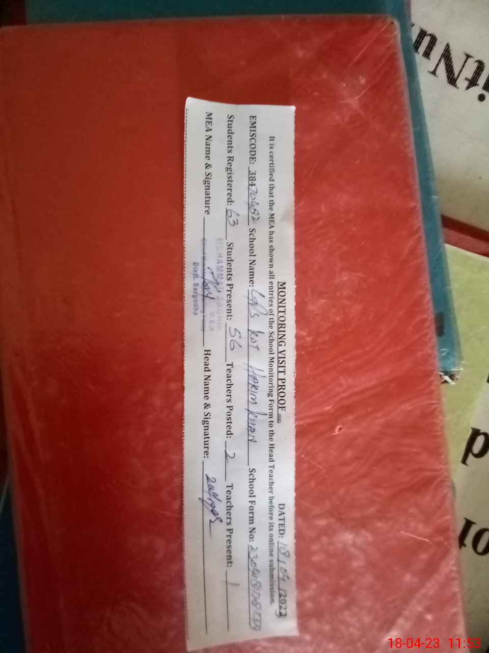 | Attendance Register | Head Teacher | MEA with School | Visit Proof |