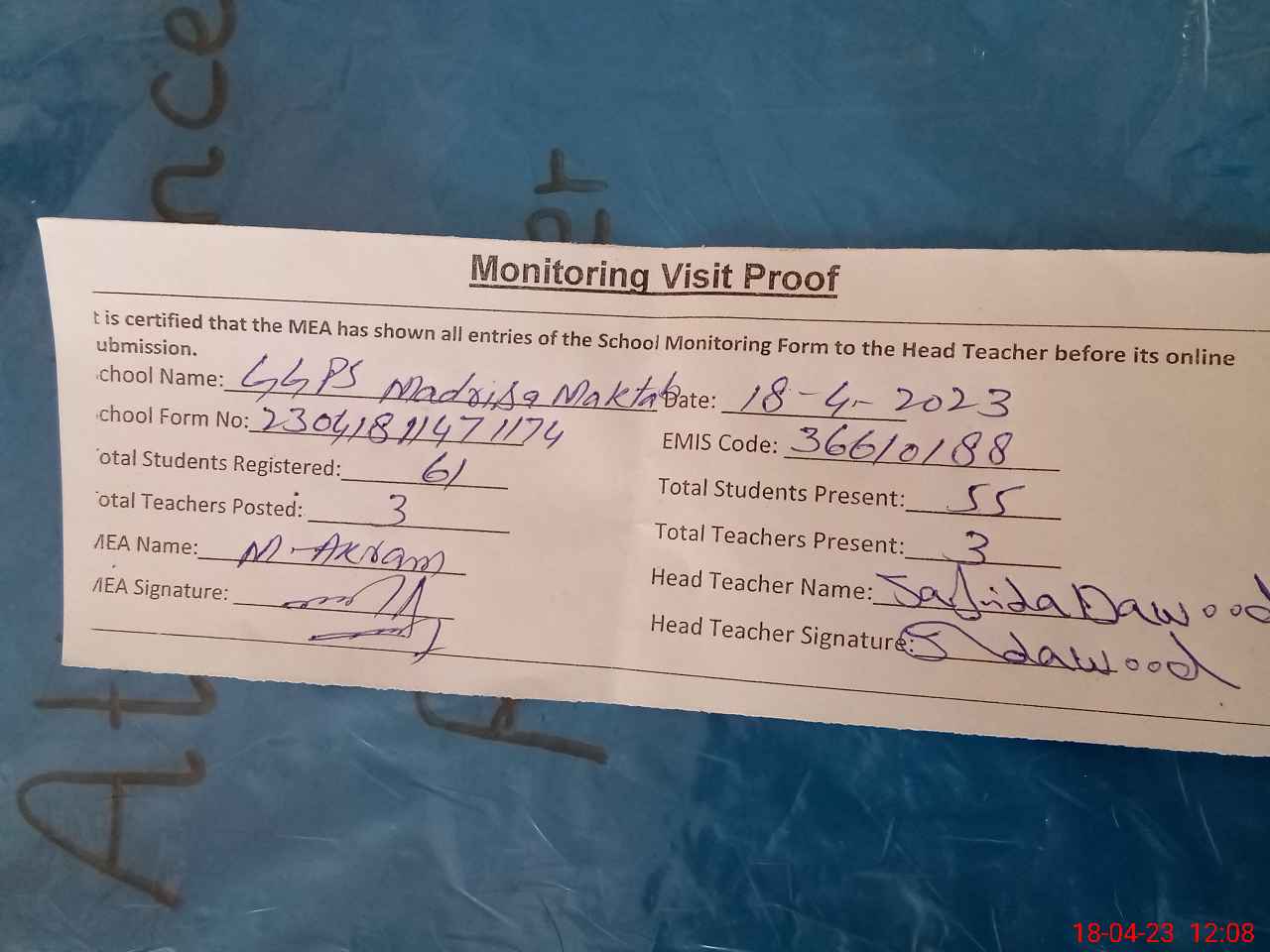 | Attendance Register | Head Teacher | MEA with School | Visit Proof |