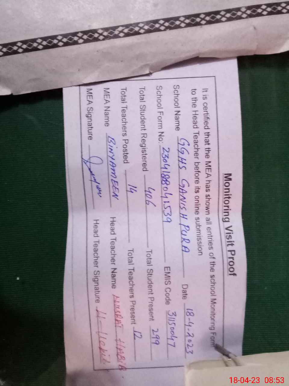 | EMIS Code: 31150047 | Name of School: GGHS GANESH PURA | |||