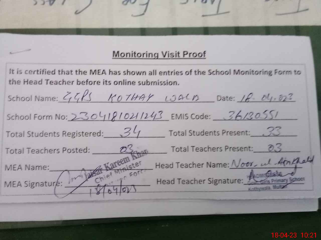 | Attendance Register | Head Teacher | MEA with School | Visit Proof |