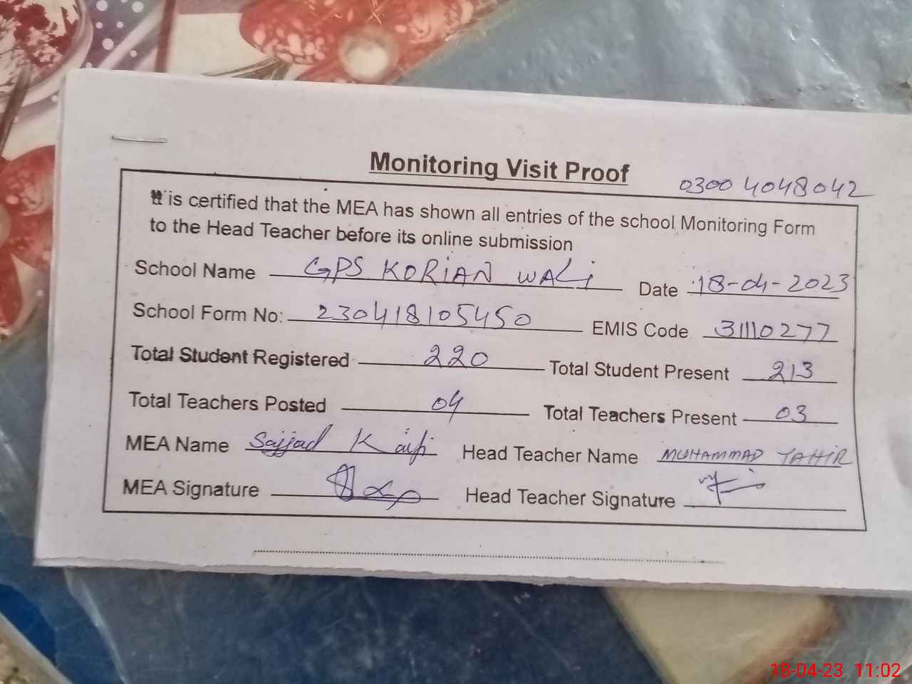 | Attendance Register | Head Teacher | MEA with School | Visit Proof |