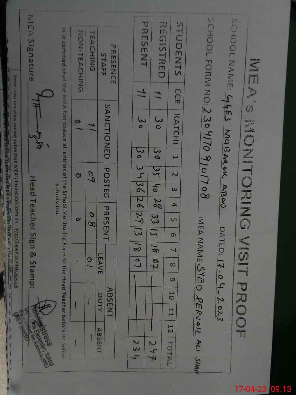 | Attendance Register | Head Teacher | MEA with School | Visit Proof |