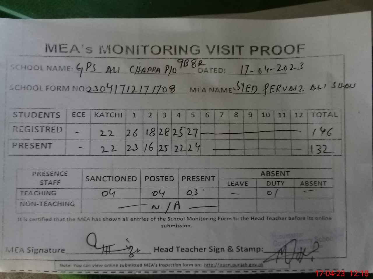 | Attendance Register | Head Teacher | MEA with School | Visit Proof |