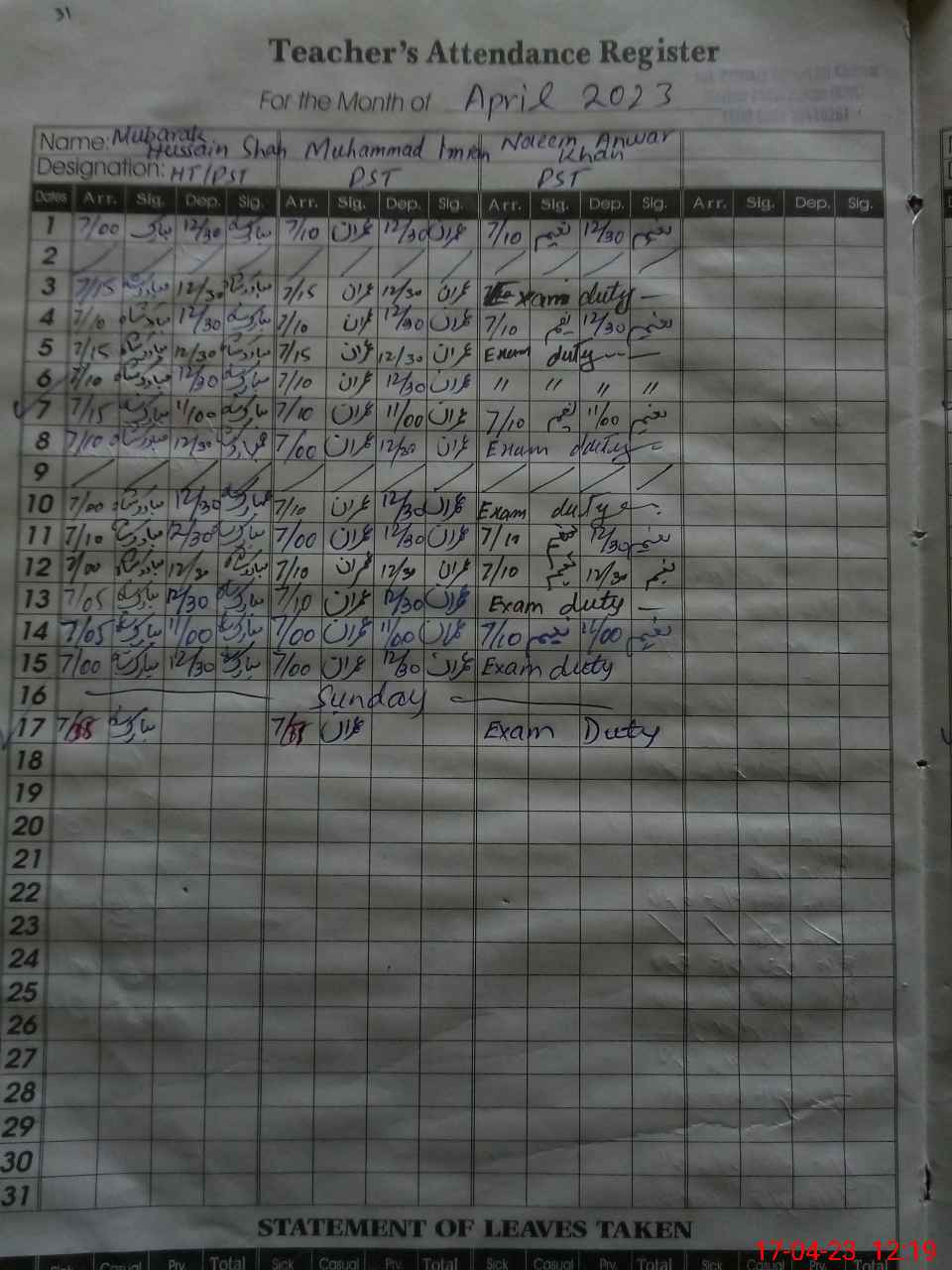 | 33**** | Na**** An**** Kh**** | PST | Regular | 0 | 0 | 0 | 0 | 0 | 0 | 0 | 0 | 0 | Exam Duty |