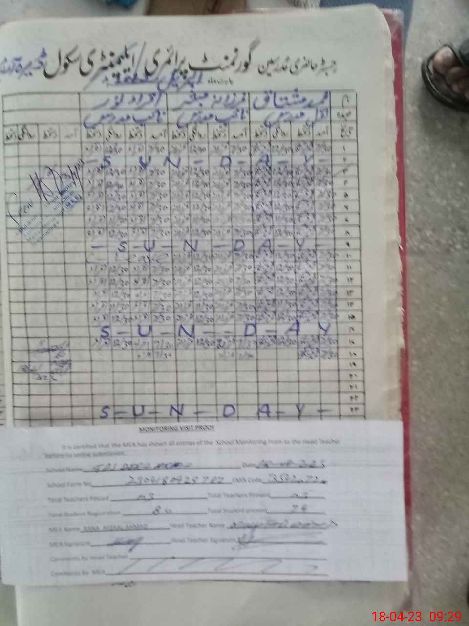 | Attendance Register | Head Teacher | MEA with School | Visit Proof |