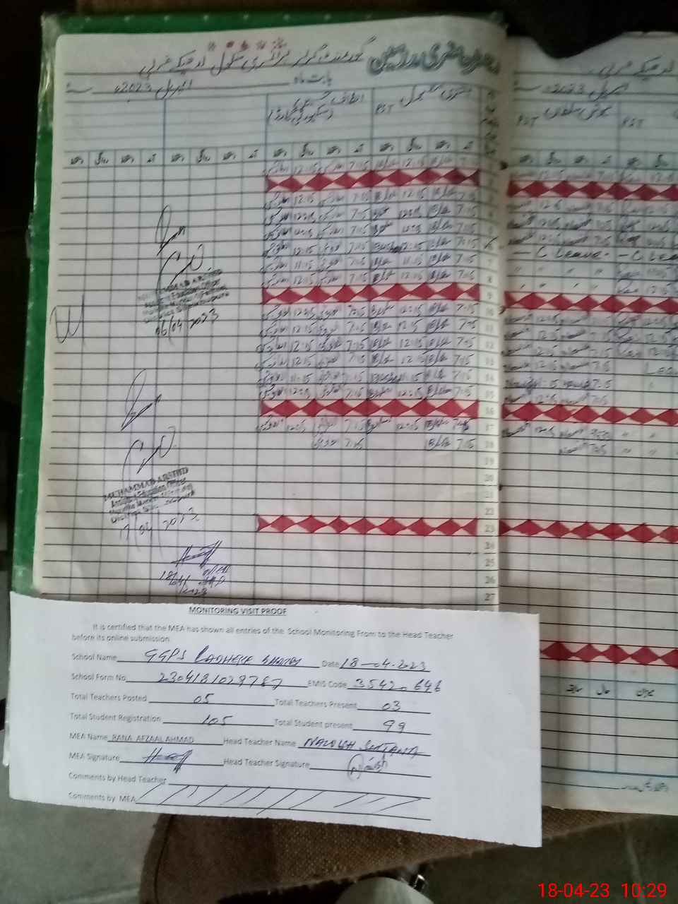 | Attendance Register | Head Teacher | MEA with School | Visit Proof |