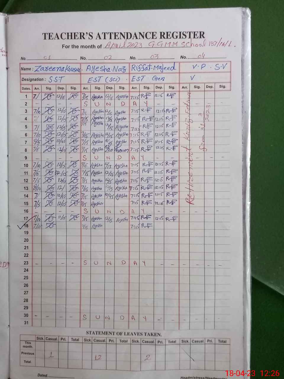 | Remarks (Use Separate Page if Required): LESSON PLANS ARE NOT AVAILABLE RANDOM CLASS ONE IS NOW IN CLASS THREE KANIZ FATIMA SV AND SAJIDA PARVEEN EST GENERAL ARE RETIRED FROM SERVICE BUT THEIR NAMES ARE STILL IN LIST OF PMIU AND AS WEL AS IN SCHOOL SIS LIST BECAUSE THEIR RETIREMENT ORDERS ARE NOT RECEIVED FROM EDUCATION AUTHORITY | |||||