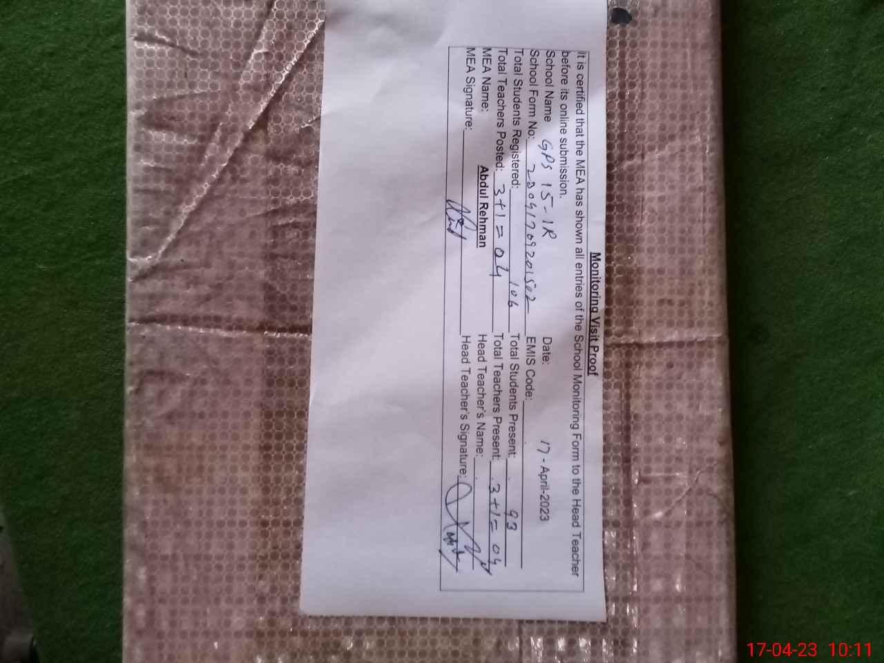 | Attendance Register | Head Teacher | MEA with School | Visit Proof |