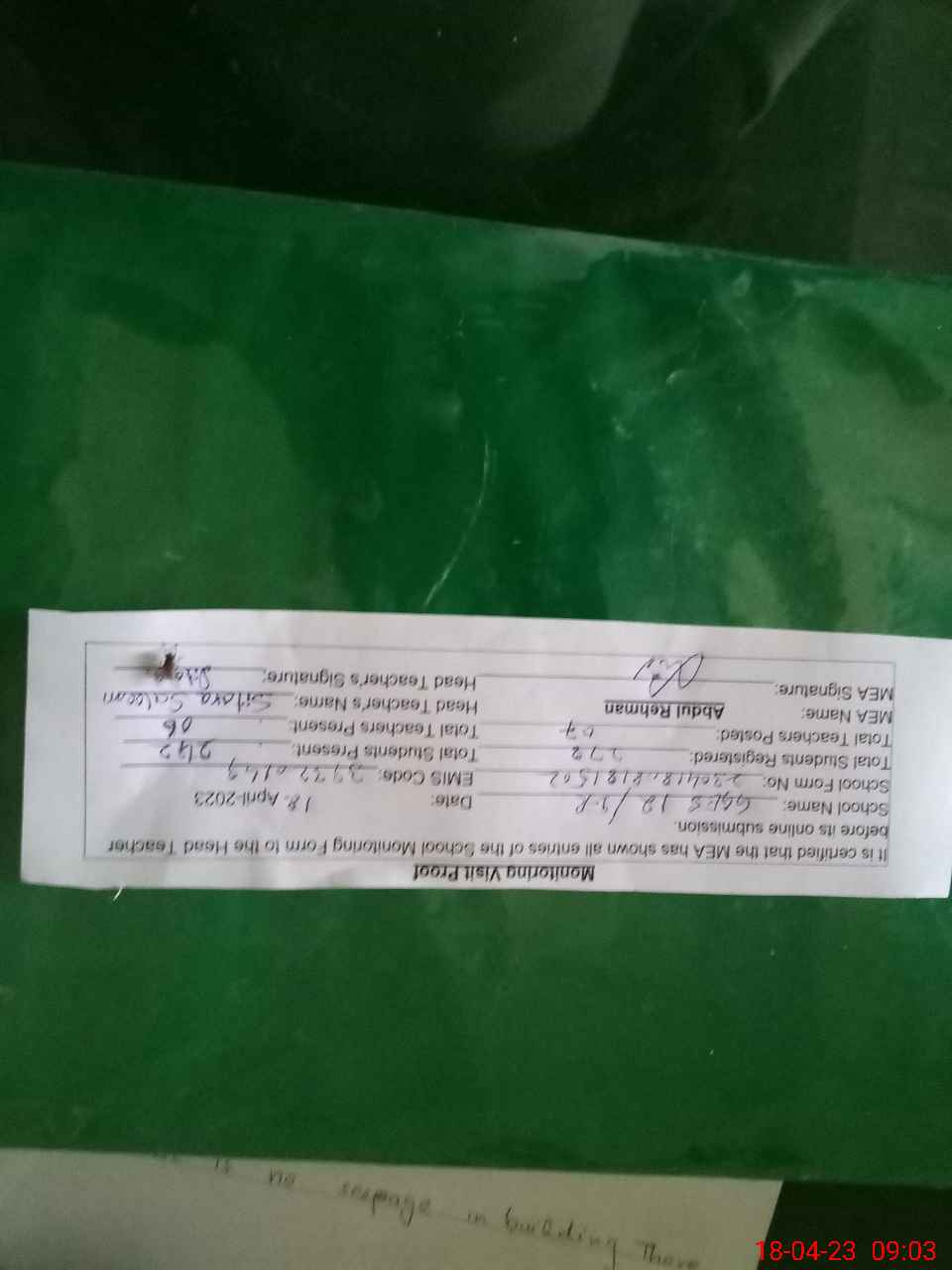 | Attendance Register | Head Teacher | MEA with School | Visit Proof |