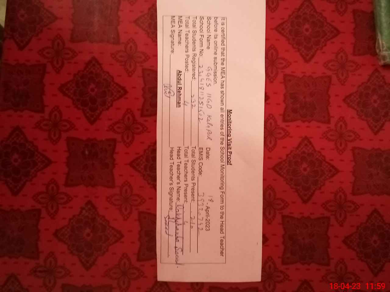 | Attendance Register | Head Teacher | MEA with School | Visit Proof |