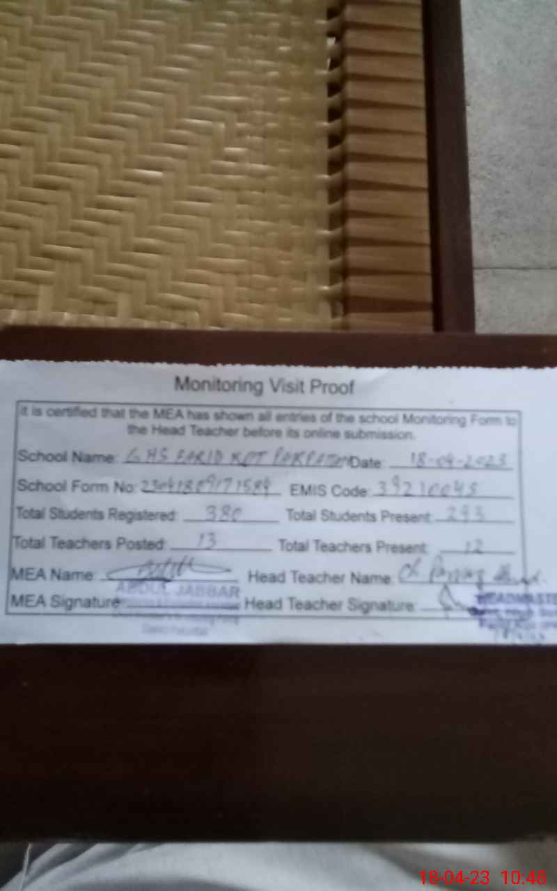 | EMIS Code: 39210045 | Name of School: GHS FARID KOT P/O PAKPATTAN | |||