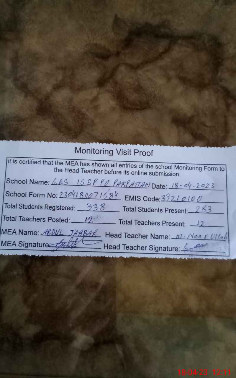 | EMIS Code: 39210100 | Name of School: GES 15/SP P.O PAKPATTAN | |||
