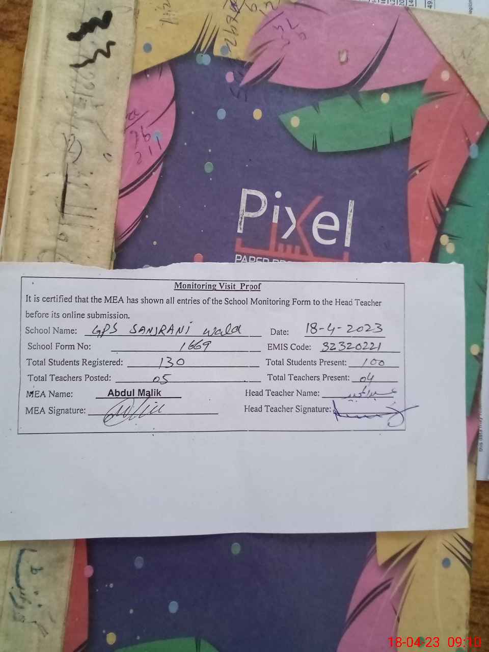 | Attendance Register | Head Teacher | MEA with School | Visit Proof |