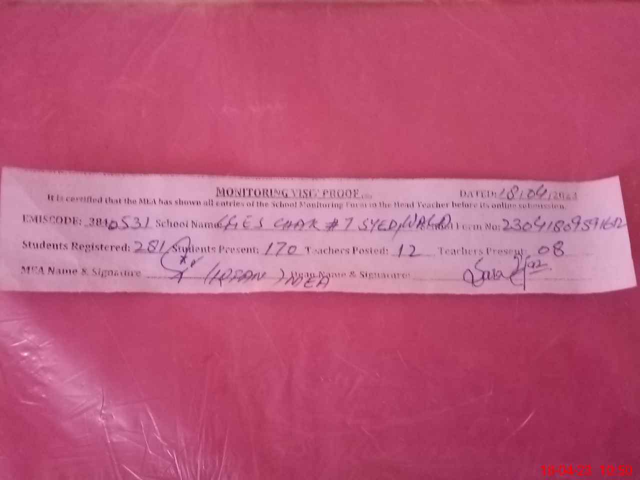 | Attendance Register | Head Teacher | MEA with School | Visit Proof |
