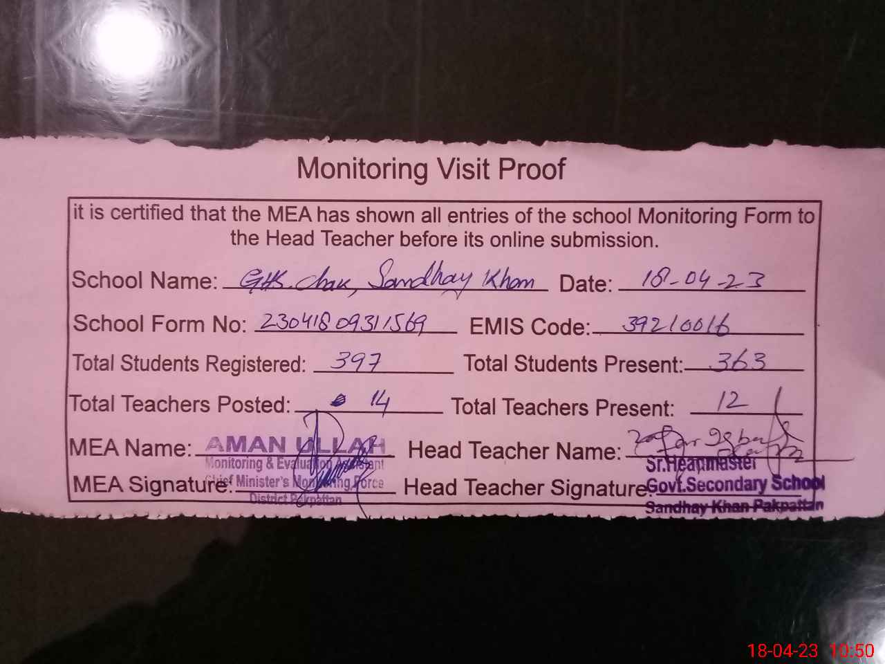 | Attendance Register | Head Teacher | MEA with School | Visit Proof |