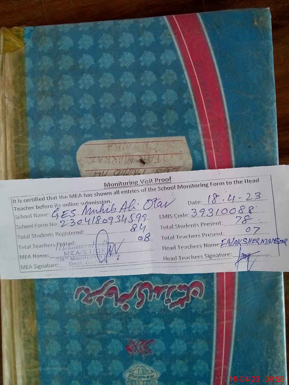 | Attendance Register | Head Teacher | MEA with School | Visit Proof |