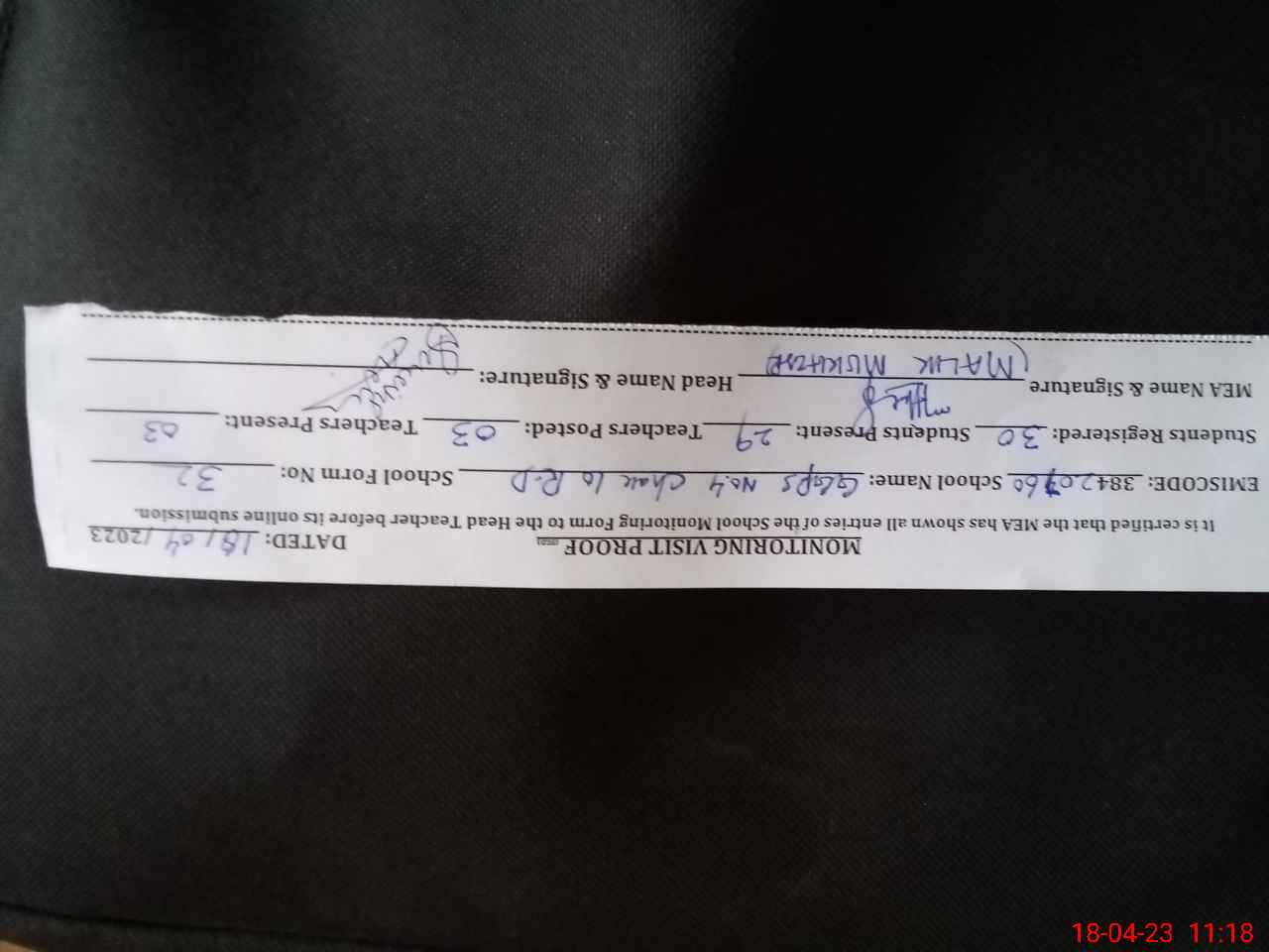 | Attendance Register | Head Teacher | MEA with School | Visit Proof |