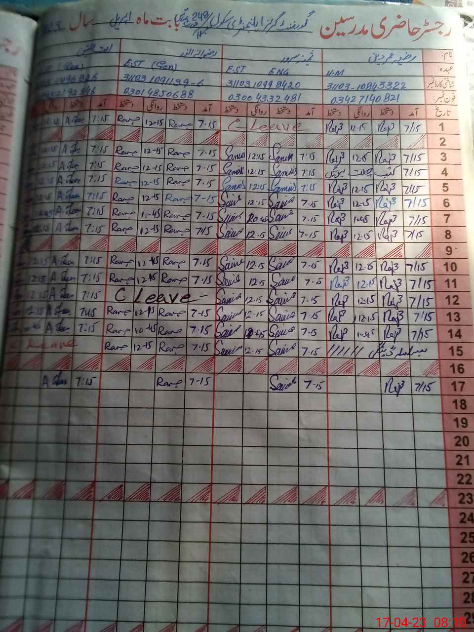 | CNIC | Full Name | Designation | R/C | Absence During Last Calender Month |