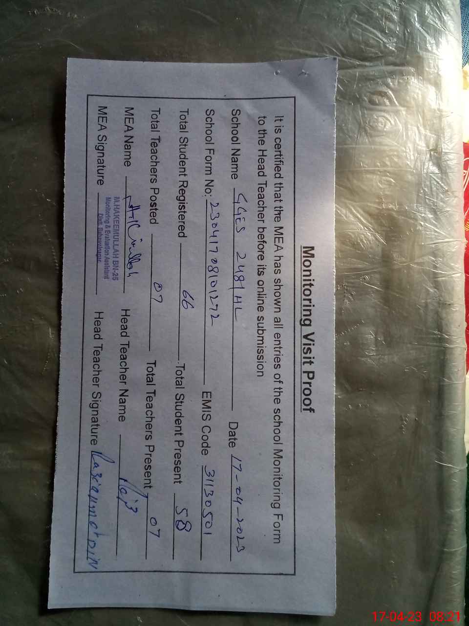 | Attendance Register | Head Teacher | MEA with School | Visit Proof |